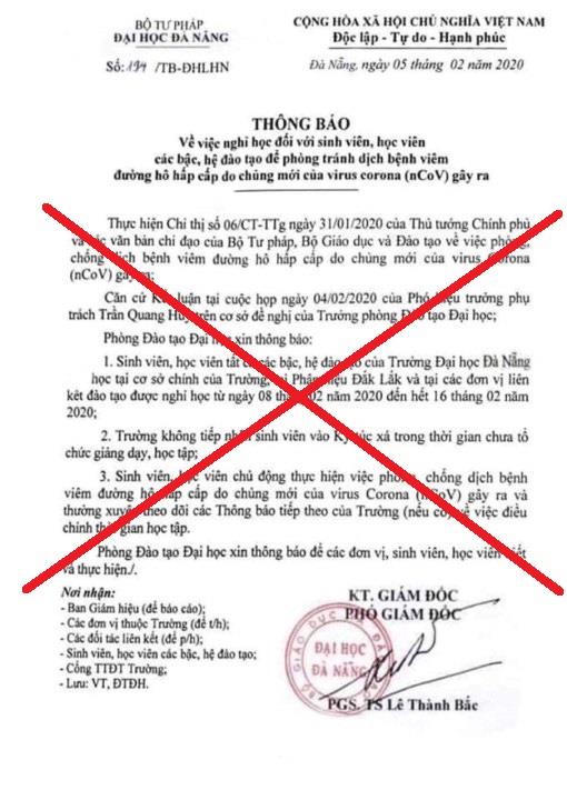 Trước đó, đơn vị này nhận được thông tin từ sinh viên liên quan đến một văn bản có nội dung cho sinh viên, học viên tất cả các bậc của Trường ĐH Đà Nẵng học tại cơ sở chính, phân hiệu Đắk Lắk và các đơn vị liên kết đào tạo được nghỉ học từ ngày 8/2 đến hết 16/2, để phòng chống virus corona.