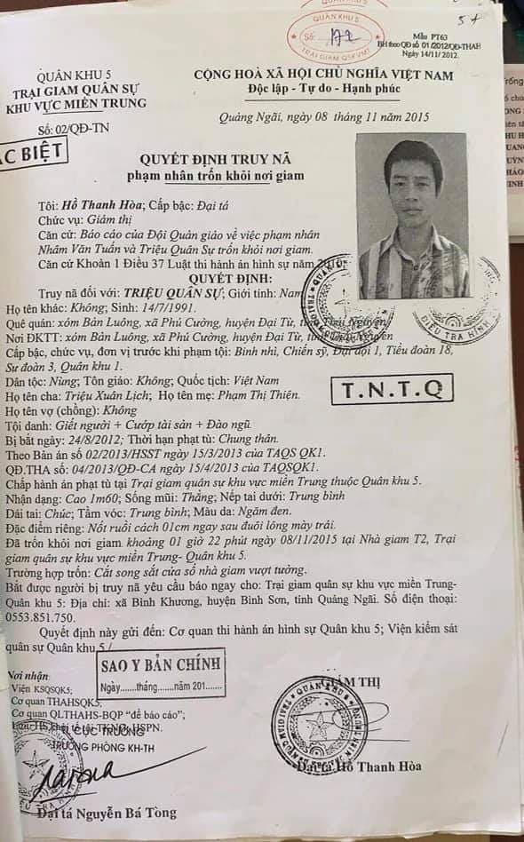 Đặc điểm nhận dạng của phạm nhân Triệu Quân Sự: cao 1,6m; sống mũi: thẳng; màu da ngăm đen; có nốt ruồi cách 1cm ngay sau đuôi long mày trái…