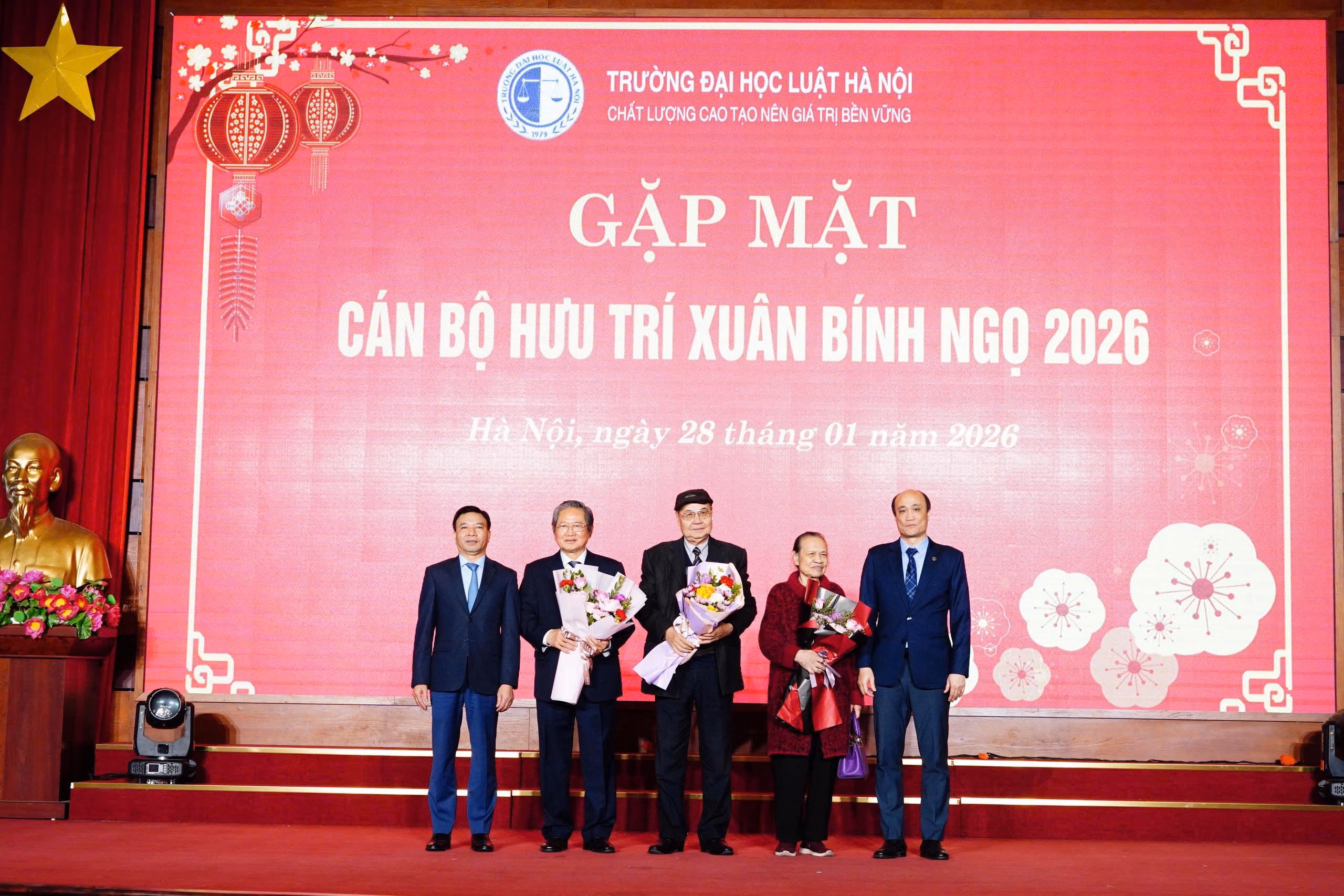 TS Chu Mạnh Hùng, Bí thư Đảng ủy (ngoài cùng bên trái) và PGS.TS Tô Văn Hòa, Hiệu trưởng Nhà trường chúc thọ, tặng quà một số cán bộ hưu trí nhân dịp Xuân Bính Ngọ 2026. (Ảnh: H.Giang)
