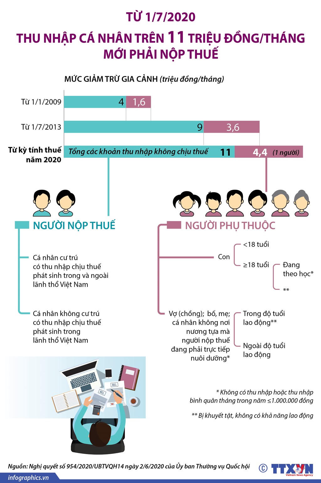 Theo Nghị quyết số 954/2020/UBTVQH14 của Ủy ban Thương vụ Quốc hội về điều chỉnh mức giảm trừ gia cảnh (GTGC) của thuế thu nhập cá nhân (TNCN), từ ngày 1/7/2020, mức GTGC của thuế TNCN sẽ được nâng từ 9 triệu đồng hiện nay lên mức 11 triệu đồng/tháng đối với đối tượng nộp thuế, và từ 3,6 triệu đồng lên 4,4 triệu đồng/tháng đối với người phụ thuộc.