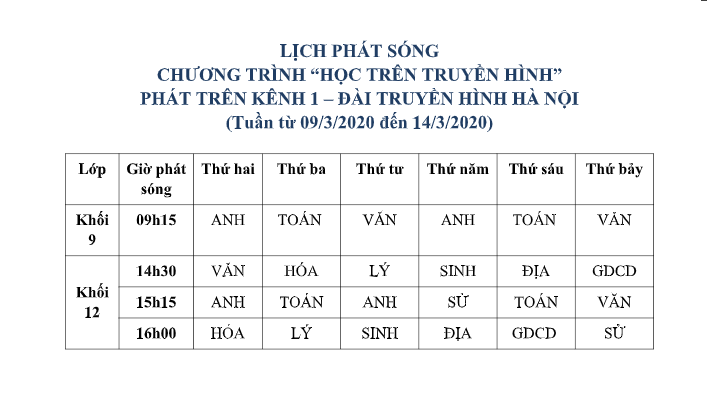 Theo đó, từ 9 giờ 15 hôm nay, 9-3, các bài giảng cho học sinh lớp 9 và lớp 12 sẽ bắt đầu được phát sóng trên Truyền hình Hà Nội để giúp học sinh ôn luyện và học tập trong thời gian nghỉ phòng chống dịch Covid-19.