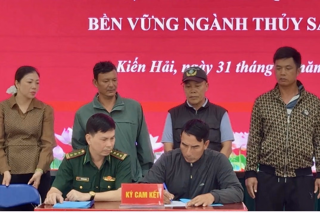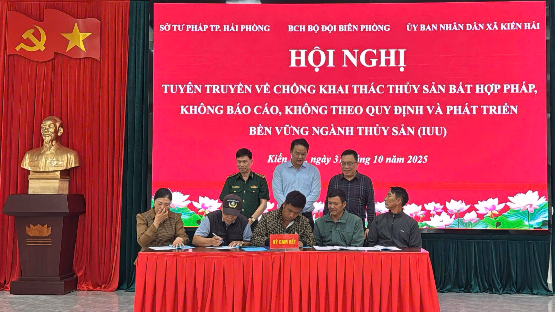 Cũng tại Hội nghị, Thượng tá Phạm Ngọc Bình, Phó Chủ nhiệm Chính trị Bộ đội biên phòng thành phố, Chủ tịch UBND xã Kiến Hải, ông Vũ Huy Thưởng và đại diện ngư dân, chủ tàu thuyền đã ký cam kết về Chống khai thác thủy hải sản bất hợp pháp, không báo cáo, không theo quy định. Ngay sau đó, Ban Chỉ huy Bộ đội biên phòng TP và lãnh đạo Sở Tư pháp đã tặng áo phao và sách pháp luật cho bà con ngư dân ...