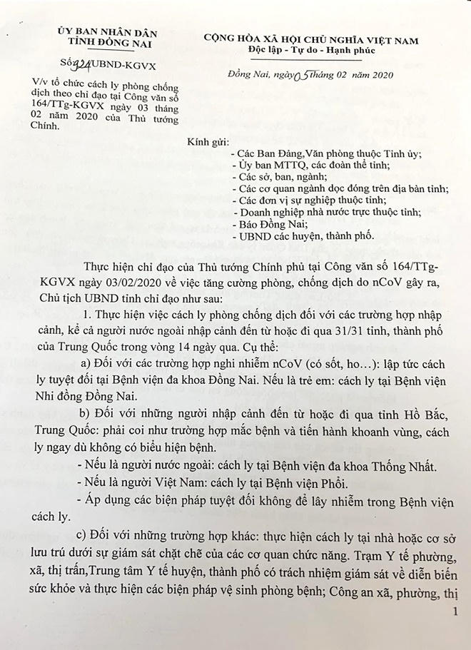 (PLVN) - Ngày 5/2, UBND tỉnh Đồng Nai ban hành Công văn số 924/UBND-KGVX về tổ chức cách ly phòng chống dịch do nCoV gây ra theo chỉ đạo của Thủ Tướng Chính Phủ.