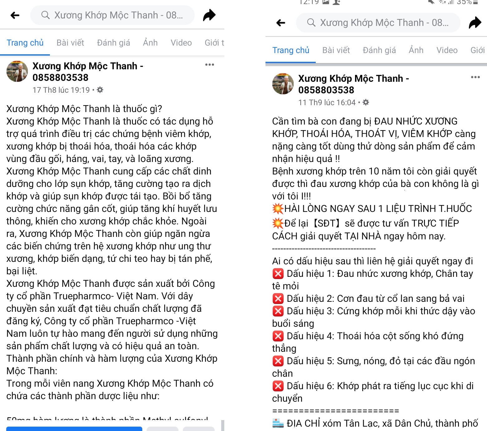 Đồng thời, xương khớp Mộc Thanh được nhóm đối tượng gán với rất nhiều chân dung người nổi tiếng là nghệ sĩ, bác sĩ và sử dụng hàng loạt các câu chuyện, hình ảnh của khách hàng chia sẻ về công dụng và hiệu quả với mục đích “khuyên dùng”, ngầm khẳng định sản phẩm này có tác dụng như thuốc chữa bệnh.