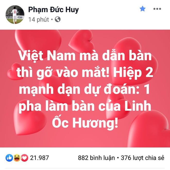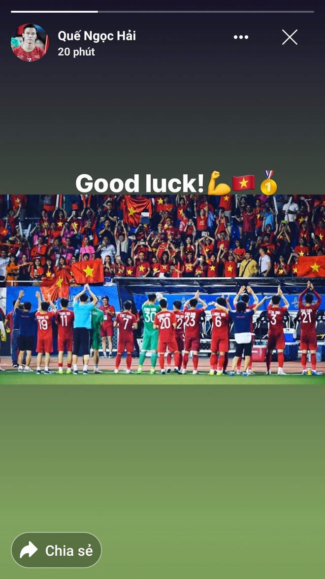 (PLVN) -Trên trang cá nhân, các cầu thủ tuyển quốc gia Việt Nam như Quế Ngọc Hải, Phạm Đức Huy, Duy Mạnh gửi lời chúc mừng chiến thắng của tuyển U22 Việt Nam tại SEA Games 30.