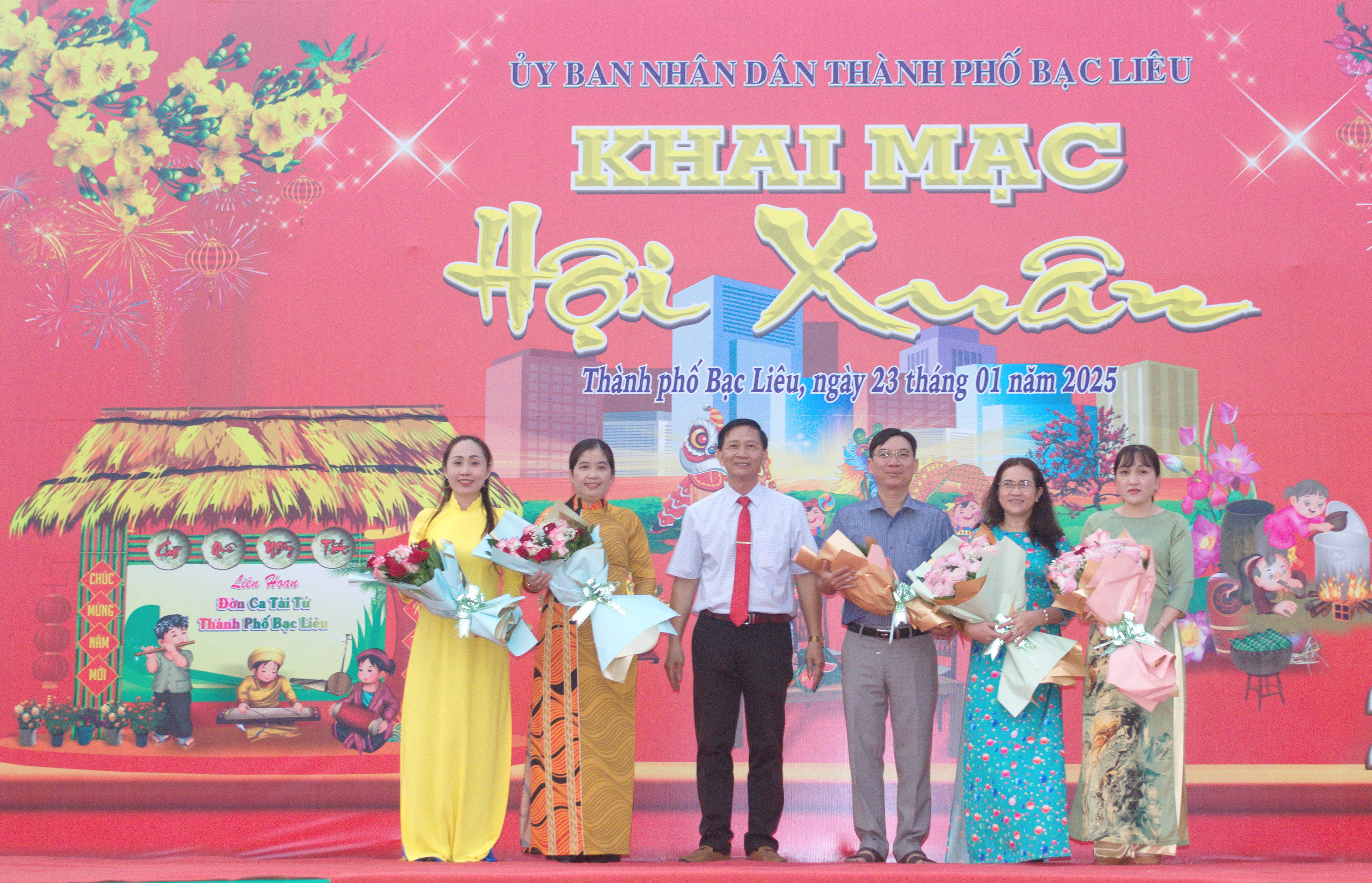 Ông Trần Văn Mậu - Phó Chủ tịch Thường trực UBND TP. Bạc Liêu, tặng hoa cho Ban giám khảo. |