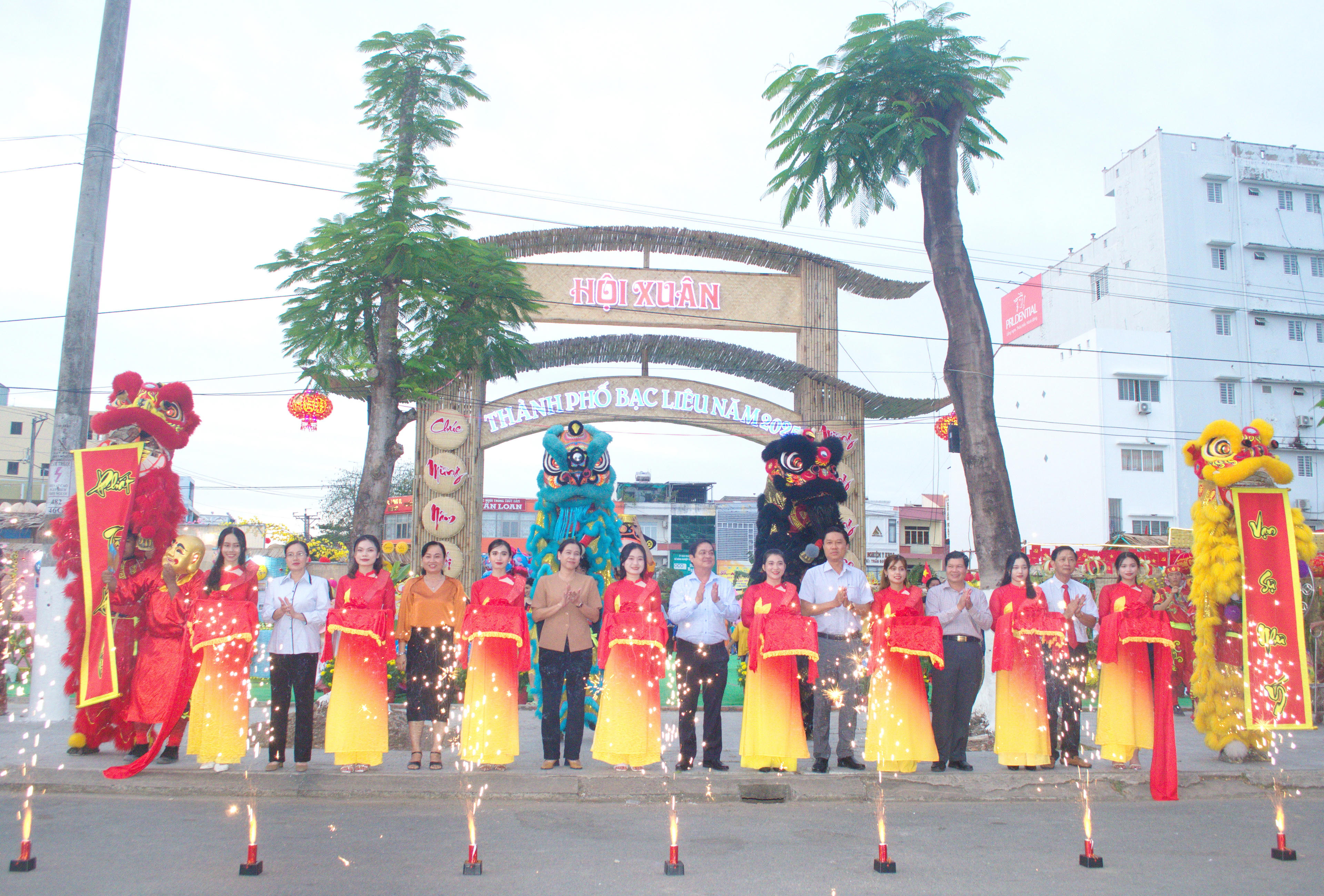 Lãnh đạo tỉnh, Sở, ngành tỉnh Bạc Liêu và TP. Bạc Liêu, nghi thức cắt băng khai mạc Hội Xuân “Chợ quê ngày Tết” 2025. |