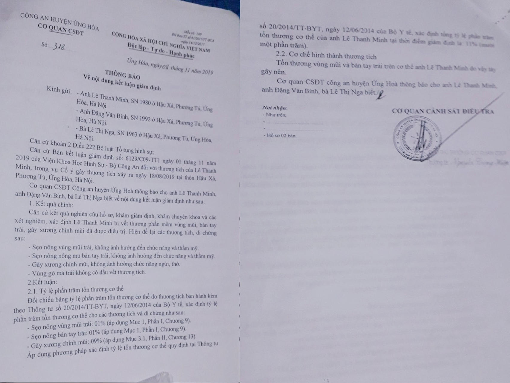 Ngày 08/11/2019, Cơ quan CSĐT, Công an huyện Ứng Hòa Thông báo về nội dung kết luận giám định, xác định, anh Minh bị vết thương vùng mũi, bàn tay trái, gãy xương mũi. Hiện để lại các di chứng như sẹo nông vùng mũi trái; sẹo nông mu bàn tay trái; Gãy xương chính mũi. Tổng tỷ lệ phần trăm tổn thương cơ thể của anh Minh tại thời điểm giám định là 11%.