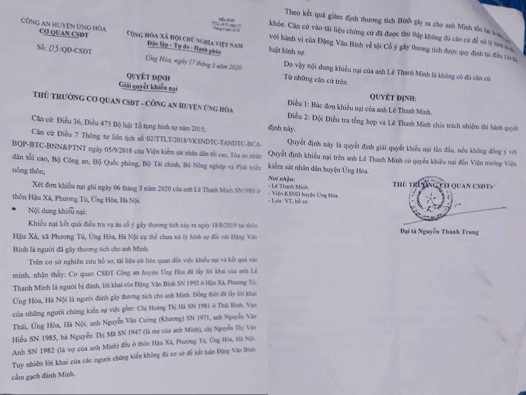 Đến ngày 17/3/2020, Cơ quan CSĐT – Công an huyện Ứng Hòa ra Quyết định giải quyết khiếu nại của anh Lê Thanh Minh như sau: "Bác đơn khiếu nại của ông Minh về việc “cố ý gây thương tích” do ông Đặng Văn Bính gây ra, đồng thời không khởi tố ông Bính vì chưa đủ căn cứ để cấu thành tội phạm nên chỉ xử phạt hành chính".