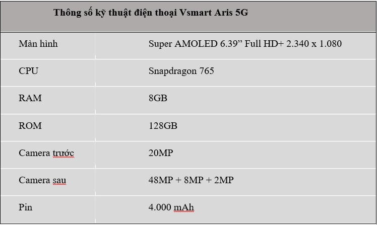 Vsmart Aris 5G là thành quả của quá trình hợp tác giữa Qualcomm và VinSmart. Sản phẩm thuộc phân khúc cận cao cấp, sở hữu những tính năng cao cấp và độc đáo như khung kim loại nguyên khối, hỗ trợ mạng 5G Sub 6 GHz, tích hợp chip bảo mật lượng tử. Đặc biệt, sản phẩm sử dụng chipset Snapdragon 765 tiên tiến có hiệu năng vượt trội và khả năng hỗ trợ nhiều công nghệ.