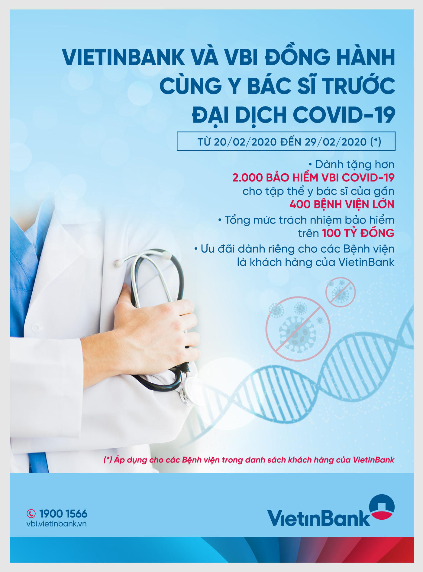 Cụ thể: Từ ngày 20/2/2020 - 29/2/2020, VietinBank phối hợp cùng Tổng Công ty Bảo hiểm VietinBank (VBI) triển khai Chương trình “VietinBank và VBI đồng hành cùng các y, bác sỹ trước đại dịch Covid-19”. Trong Chương trình này, VietinBank dành tặng các bác sỹ tại các bệnh viện đang có quan hệ với VietinBank trên toàn quốc 2.000 Gói bảo hiểm Covid-19 với tổng mức trách nhiệm bảo hiểm trên 100 tỷ đồng.