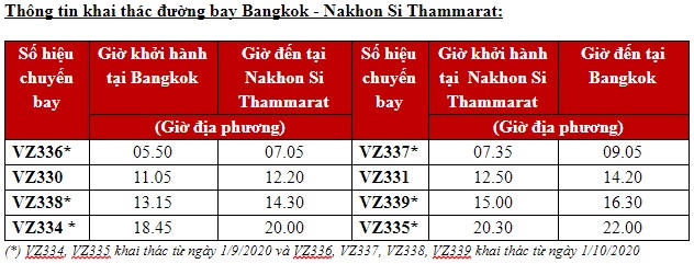 Với thời gian bay 1 tiếng 15 phút cho mỗi chiều bay, đường bay mới được khai thác một chuyến khứ hồi hàng ngày từ 6/8 và tăng tần suất lên 4 chuyến mỗi ngày trong tháng 10. Bên cạnh đó, với sự hưởng ứng nhiệt tình của hành khách dành cho đường bay đến Nakhon Si Thammarat, hãng cũng sẵn sàng để tăng tần suất khai thác lên 5 chuyến mỗi ngày vào cuối năm.