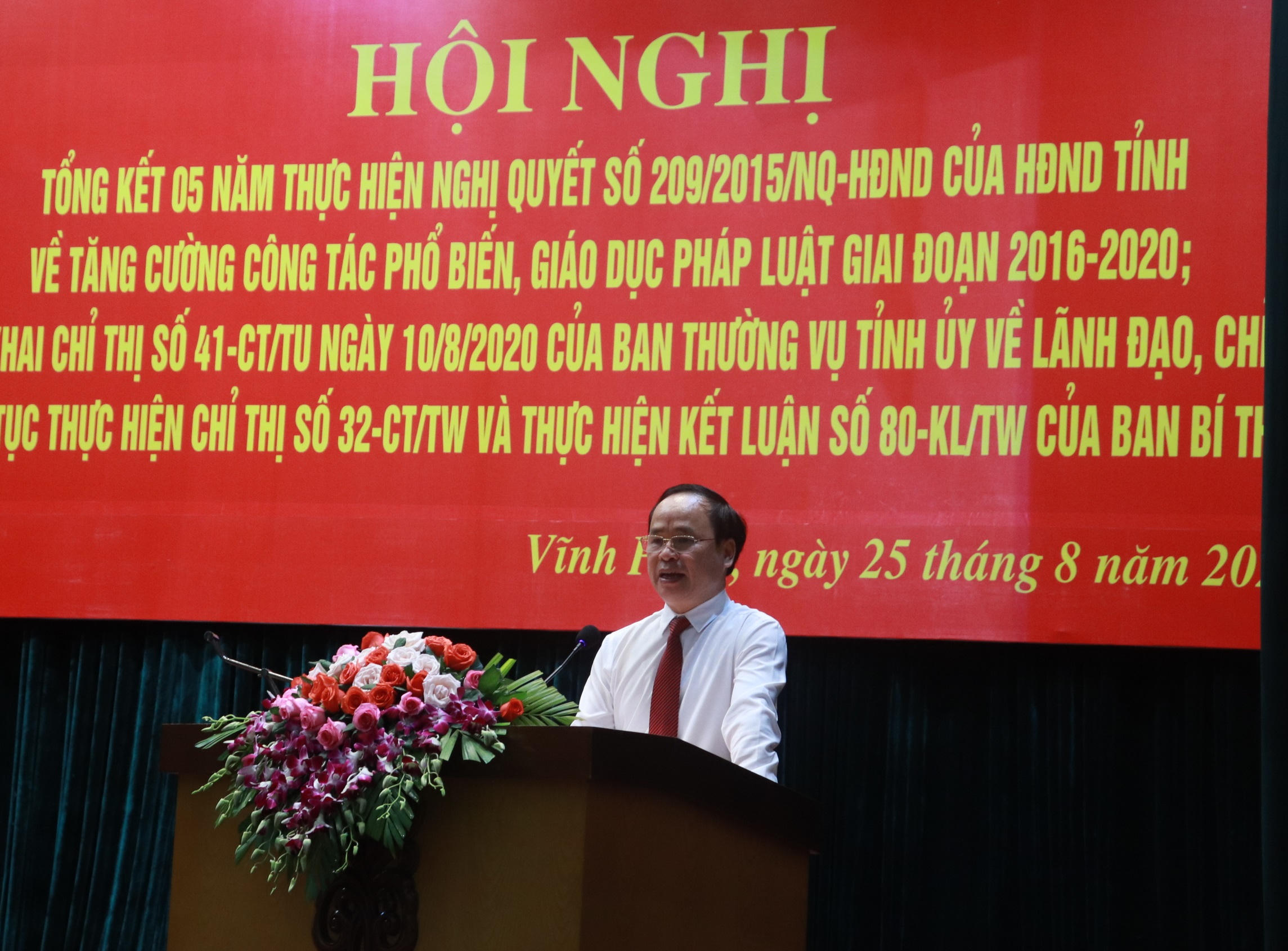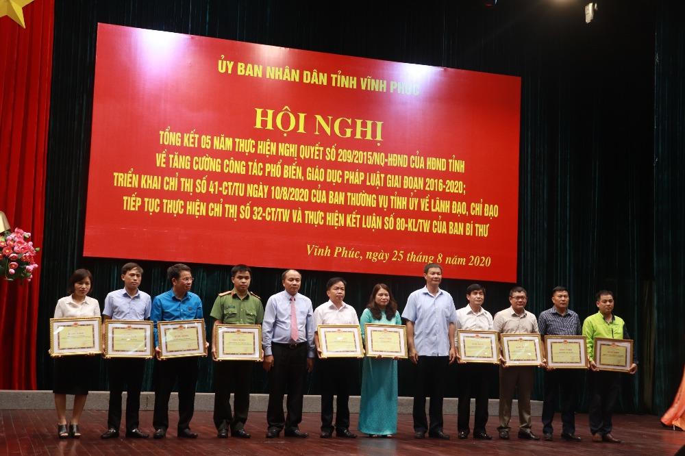 (PLVN) -Sáng 25/8, UBND tỉnh Vĩnh Phúc tổ chức Hội nghị tổng kết 5 năm thực hiện Nghị quyết 209/2015/NQ-HĐND của HĐND tỉnh về tăng cường phổ biến, giáo dục pháp luật (PBGDPL) giai đoạn 2016-2020 và triển khai Chỉ thị số 41-CT/TU ngày 10/8/2020 của Ban thường vụ Tỉnh ủy về lãnh đạo, chỉ đạo tiếp tục thực hiện Chỉ thị số 32-CT/TW và thực hiện Kết luận số 80-KL của Ban Bí thư.