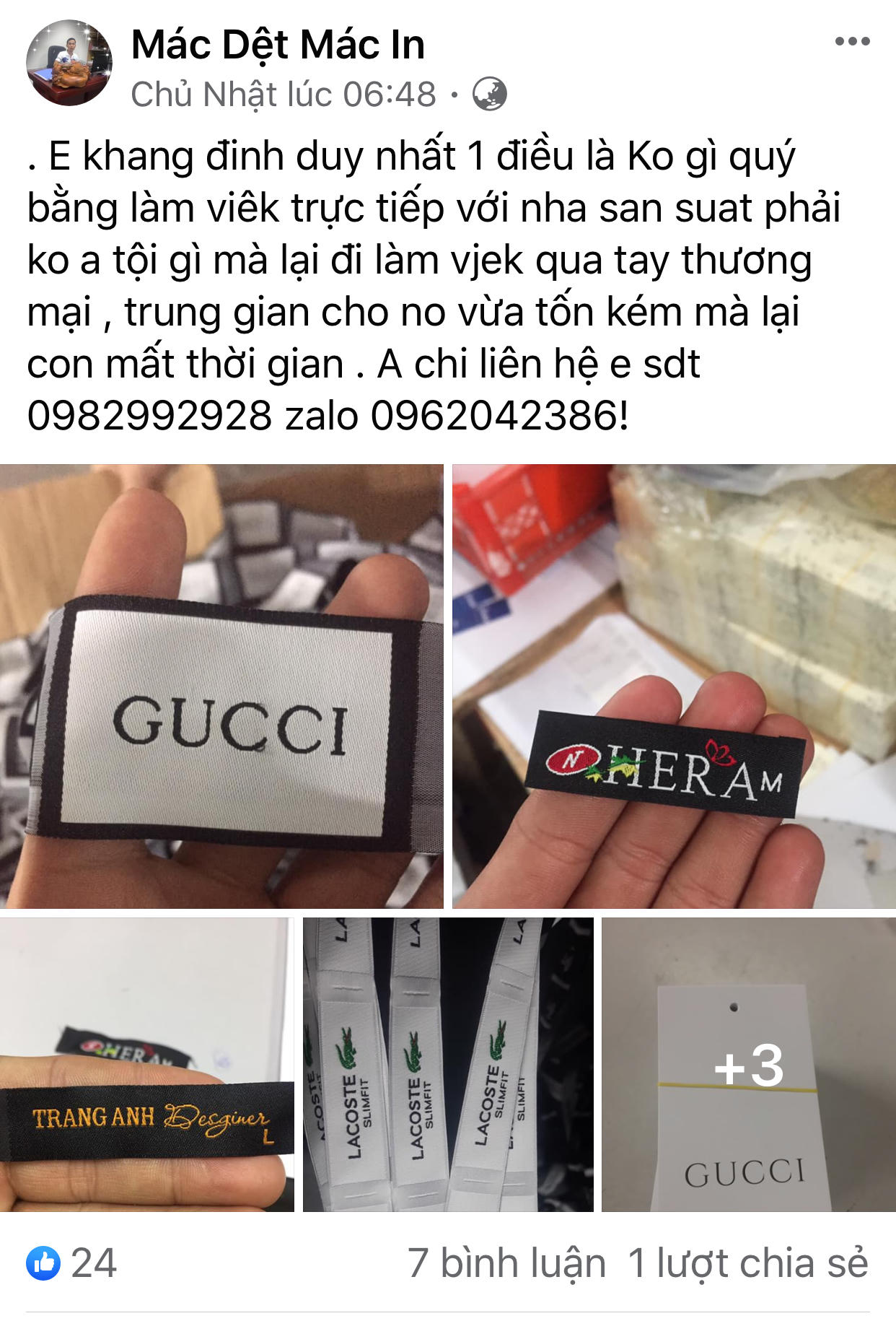 Trong vai một người chủ shop thời trang có nhu cầu cần đặt tem, nhãn của các thương hiệu lớn, trao đổi với trang web Nhãn Mác Thẻ Tag cho biết, tùy theo yêu cầu của khách hàng, khách đặt loại nào có loại đấy, từ các loại tem nhãn của các thương hiệu nổi tiếng thế giới như Zara, Gucci, Lacoste, Levis’s…. cho tới D&G, Nike… gì cũng có.