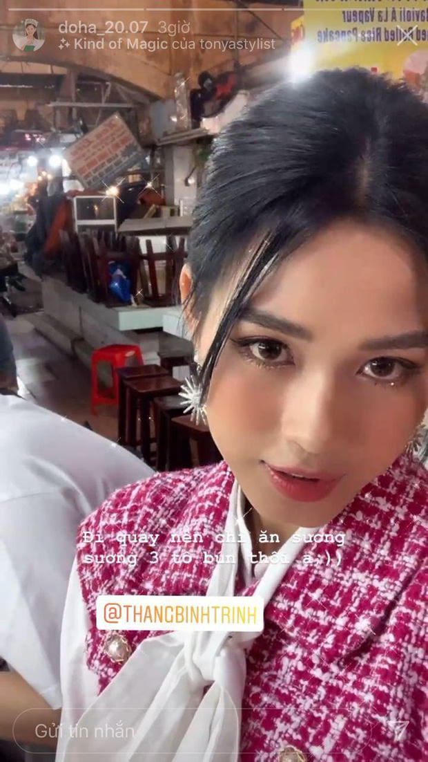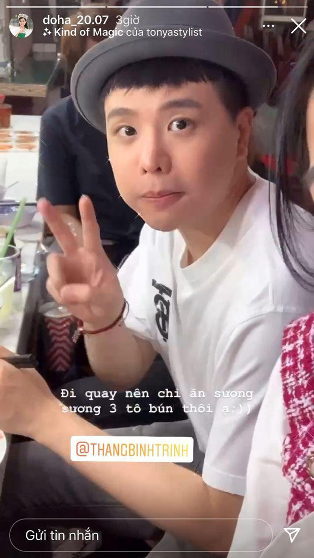 Qua hình ảnh ghi lại, có thể thấy cả Trịnh Thăng Bình và Đỗ Thị Hà rạng rỡ cạnh nhau. Cô còn chia sẻ thêm dòng trạng thái hài hước: “Đi quay nên chỉ ăn sương sương 3 tô bún thôi ạ”.