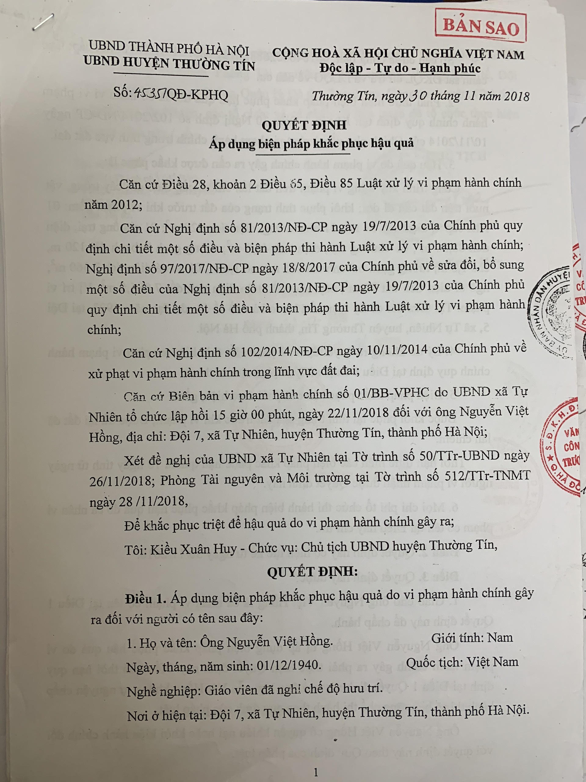 Cần phải nhắc lại, Chủ tịch UBND huyện Thường Tín căn cứ vào biên bản Vi phạm hành chính (VPHC) số 01/BB-VPHC do UBND xã Tự Nhiên ngày 22/11/2018, để ra QĐ số 4535/QĐ-KPHQ ngày 30/11/2018 áp dụng biện pháp khắc phục hậu quả.