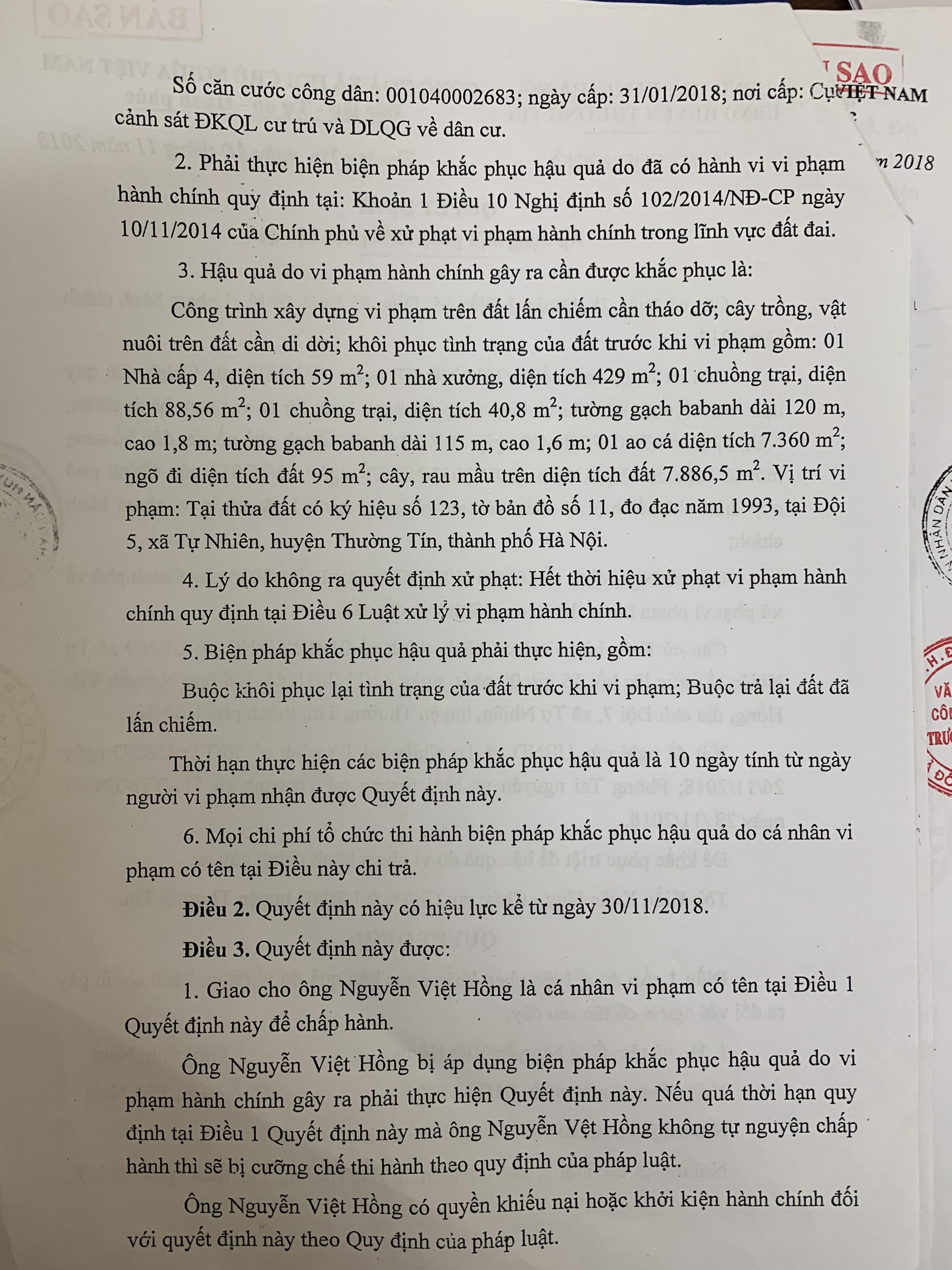Đến cuối năm 2018, UBND huyện Thường Tín cho rằng ông Hồng có hành vi lấn chiếm đất công với diện tích 16.244m2 nên ra các Quyết định (QĐ) số 4535/QĐ-KPHQ ngày 30/11/2018 quyết định áp dụng biện pháp khắc phục hậu quả và QĐ số 410/QĐ-CCKPHQ ngày 17/01/2019 về việc cưỡng chế buộc thực hiện biện pháp khắc phục hậu quả.