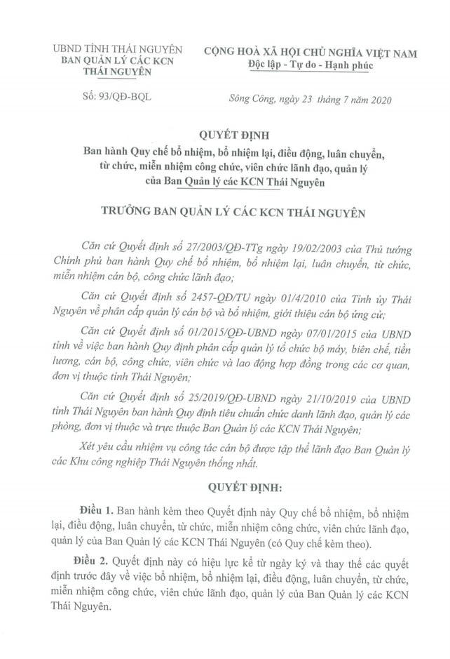Ngoài ra, khi mới được điều động giữ chức Phó Trưởng ban, ông Cường còn vội vàng ký QĐ số 93/QĐ-BQL ngày 23/7/2020 ban hành quy chế bổ nhiệm, bổ nhiệm lại, luân chuyển, từ chức, miễn nhiệm công chức, viên chức lãnh đạo quản lý của BQLCKCN Thái Nguyên với rất nhiều sai sót khó chấp nhận.