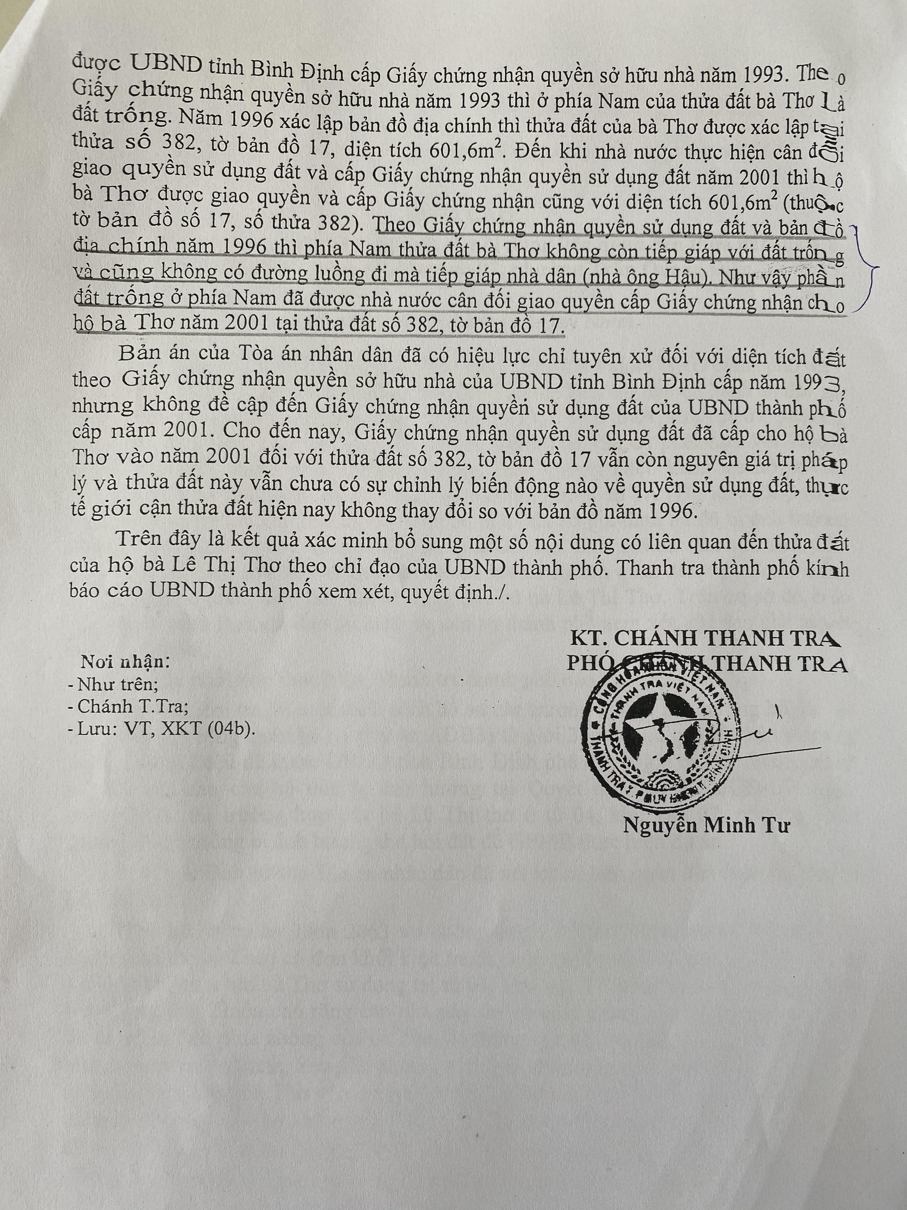 Nhận định trên của TAND TP Quy Nhơn trái ngược với những gì cơ quan chức năng từng khẳng định. Cụ thể, Thanh tra TP Quy Nhơn trong báo cáo số 52/BC-TTr ngày 08/05/2014, khi xác minh một số nội dung liên quan đến thửa đất 382 của hộ bà Thơ, cho rằng: “phía Nam thửa đất bà Thơ không còn tiếp giáp với đất trống và cũng không có đường luồng đi mà tiếp giáp nhà ông Hậu. Như vậy, phần đất trống ở phía Nam đã được Nhà nước cân đối giao quyền cấp Giấy chứng nhận cho hộ bà Thơ năm 2001 tại thửa đất số 382, tờ bản đồ 17”.
