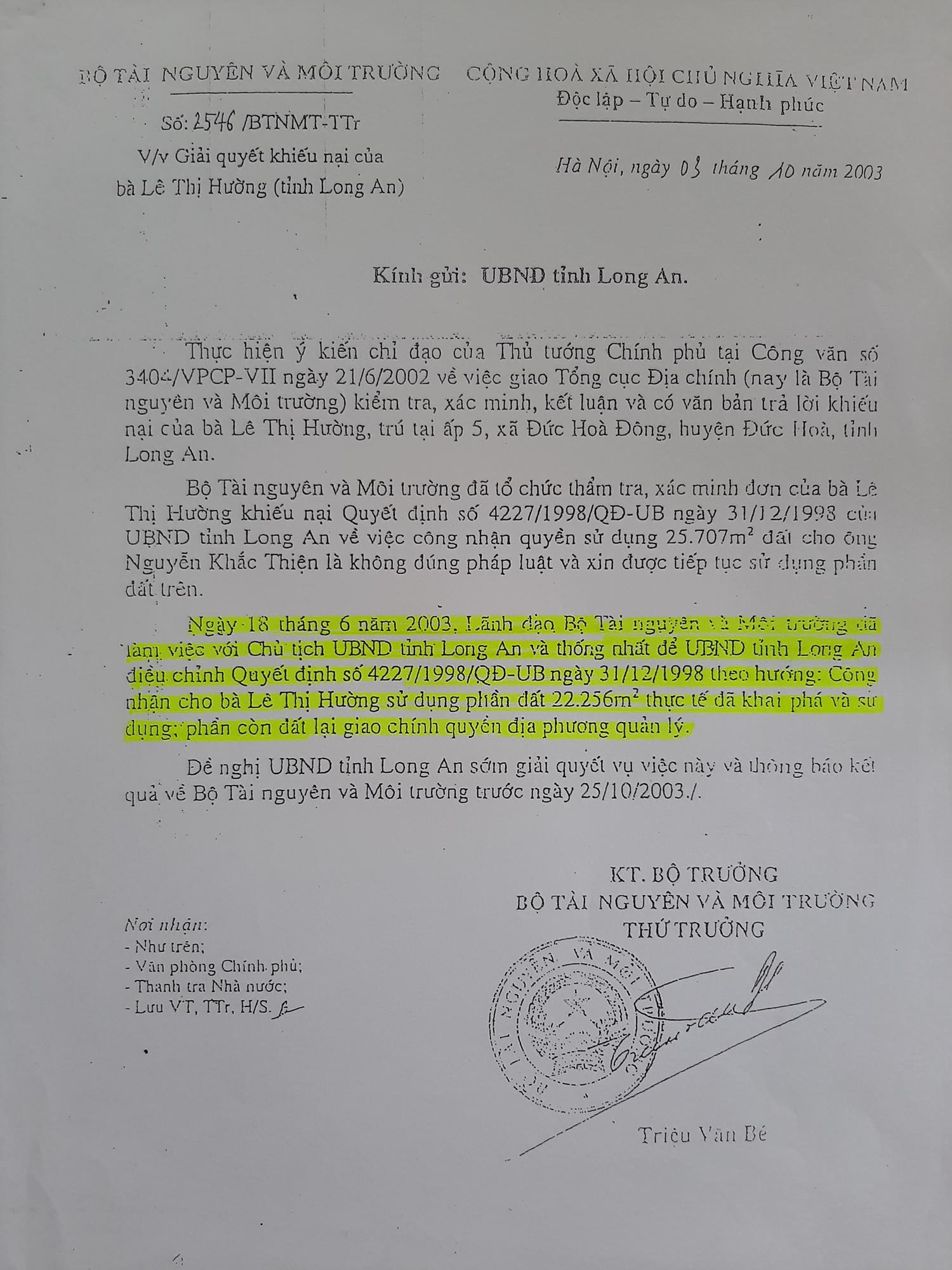 HĐXX cũng không đưa ra một căn cứ điều khoản văn bản pháp luật nào để chứng minh việc tỉnh Long An thu hồi đất bà Hường khai hoang là đúng. Trước đó, Bộ TN&MT vào năm 2003 cũng khẳng định yêu cầu công nhận đất khai hoang của bà Hường là hoàn toàn có cơ sở, phù hợp Hiến pháp năm 1980, Luật Đất đai năm 1988, Luật Đất đai năm 1993, Nghị định 64/CP ngày 27/7/1993 của Chính phủ.