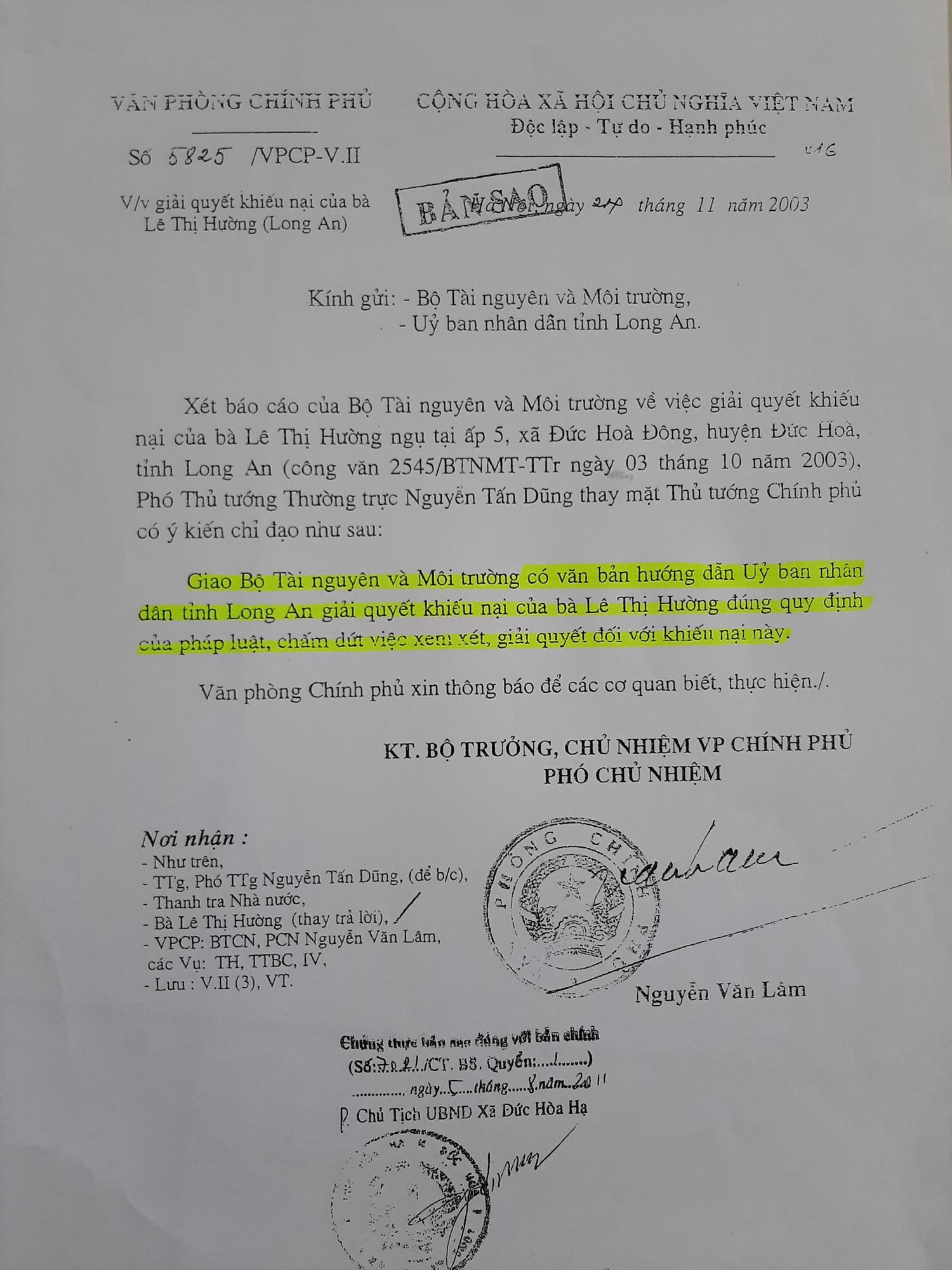 Luật sư Phượng khẳng định, việc Chủ tịch thay mặt UBND tỉnh Long An ban hành Quyết định số 2603/QĐ-UBND ngày 12/10/2007, thu hồi toàn bộ phần đất tranh chấp giao UBND huyện Đức Hòa quản lý (QĐ 2603) là chưa đúng quy định. Đặc biệt, việc ban hành quyết định thay vì căn cứ vào pháp luật thì lại căn cứ vào “công văn”. Đó là chưa nói tới việc “công văn” (Công văn số 4409/VPCP-V.II) được đề cập lại có nội dung hết sức chung chung.