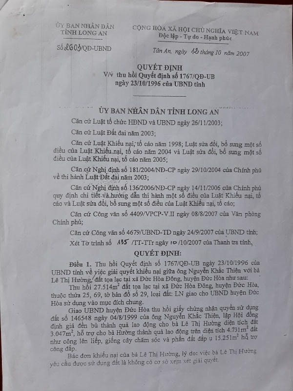 Tuy nhiên, sau đó UBND tỉnh Long An không thực hiện theo nội dung trên, thay vào đó năm 2007 tỉnh lại ra Quyết định số 2603/QĐ-UBND (QĐ 2603) ngày 12/10/2007, thu hồi toàn bộ phần đất này giao UBND huyện Đức Hòa quản lý. Như vậy, từ câu chuyện ban đầu là đất tranh chấp giữa hai người dân sau một thời gian giải quyết đã trở thành đất công.