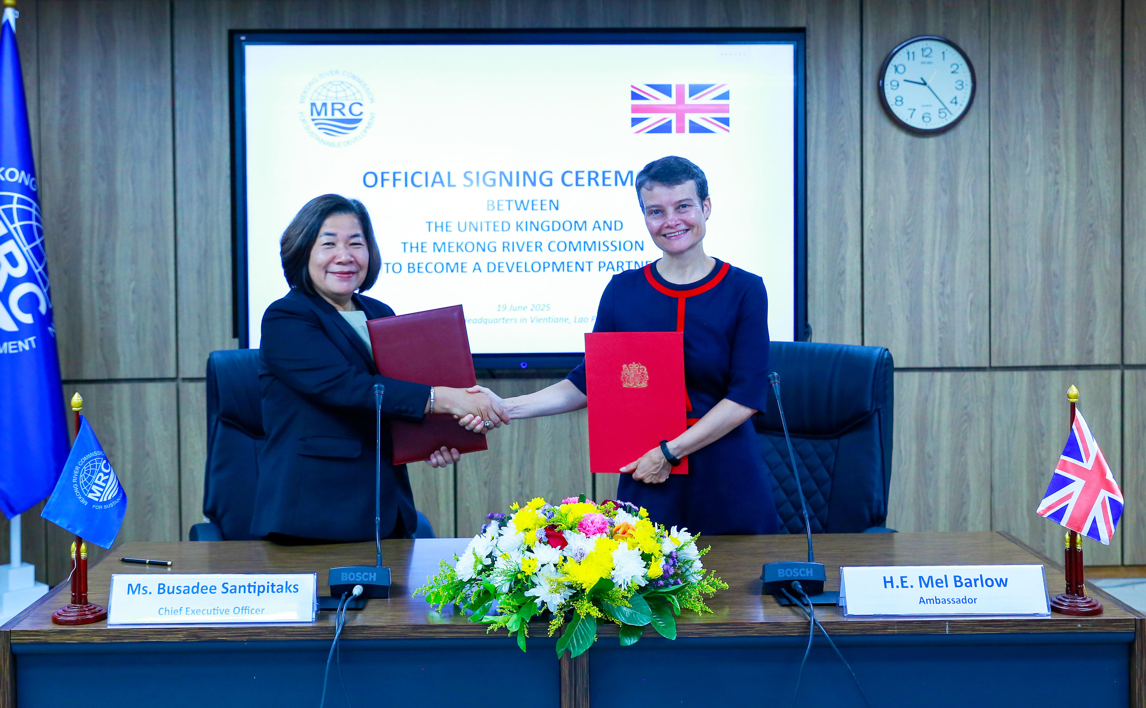 Tổng Giám đốc Ban Thư ký MRC Busadee Santipitaks (trái) và Đại sứ Anh tại Lào Mel Barlow (phải) tại Lễ ký kết. Ảnh: Đại sứ quán Anh |