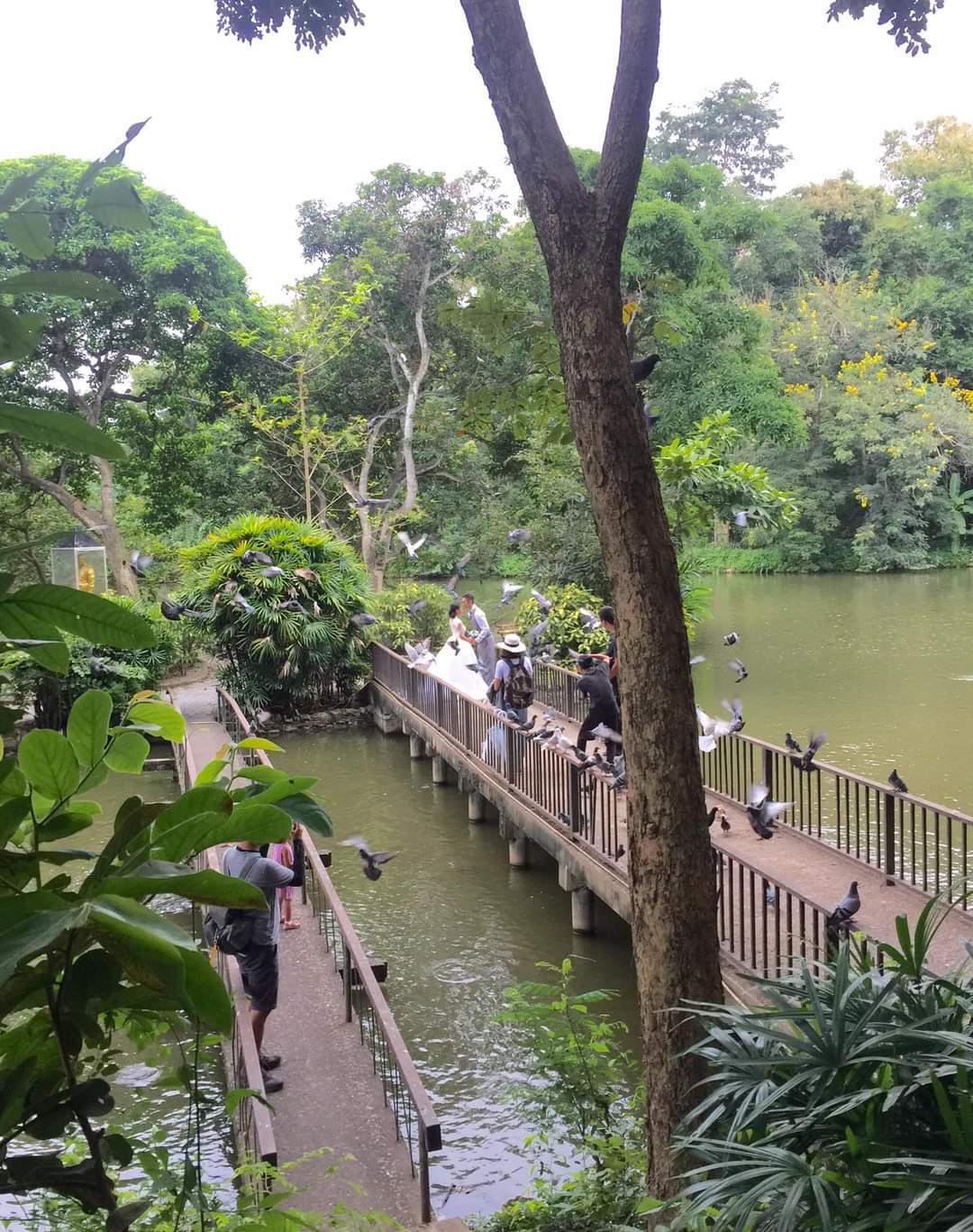Có người, đến thăm vì câu nói “Chưa đến Wat Umong chưa thực sự hiểu Chiang Mai”. Hôm tôi đến, có một cặp tình nhân đang chụp ảnh cưới ở đây. Họ đứng trên cầu cầu treo chia hai nửa hồ, cô dâu tung bánh mì khiến hàng trăm chú bồ câu xinh đẹp ùa đến trên vai cô, tạo thành một cảnh tượng vô cùng đẹp mắt. Chú rể người Chiang Mai, cô dâu là người tỉnh khác đến đây làm việc, họ bén duyên nhau trong một lần đến viếng Wat Umong, và quay lại đây thường xuyên để tạ lễ. Họ cũng chọn ngôi chùa để chụp những bộ ảnh cưới. Và con cái của họ sau này, có lẽ cũng sẽ thường xuyên đến đây.