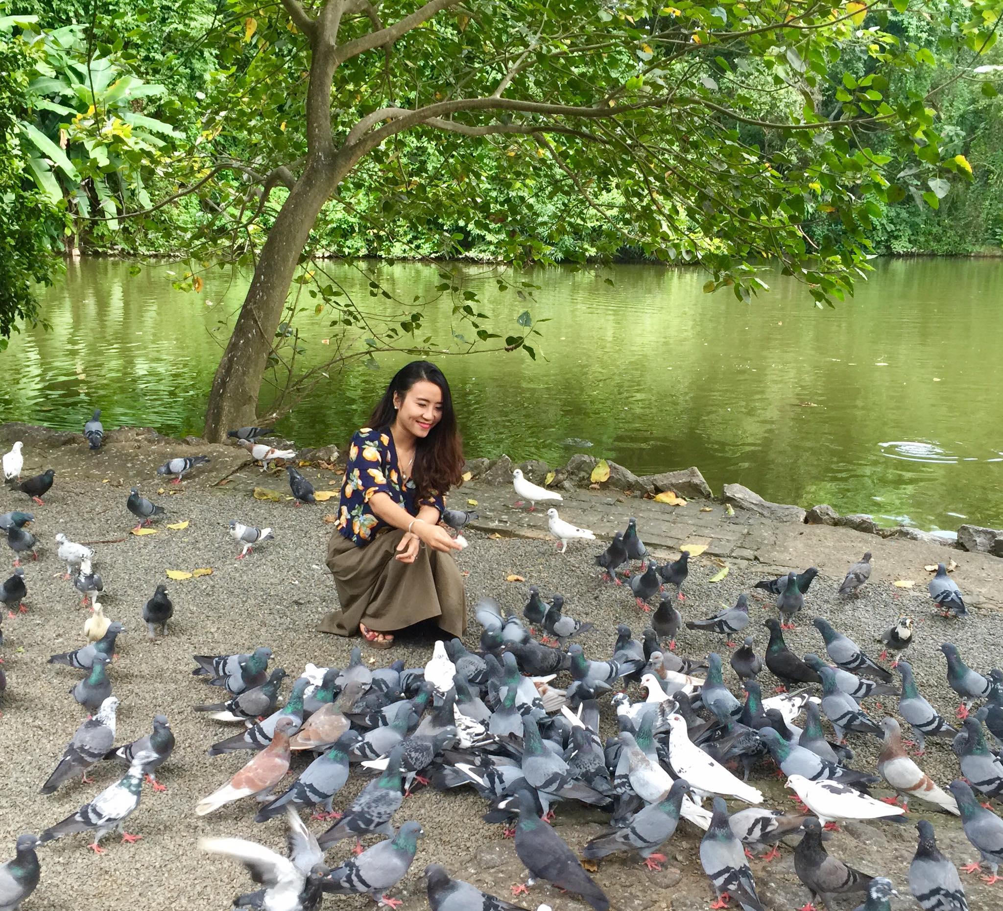 Còn tôi, tôi đến Wat Umong làm gì, vào một ngày mùa thu trong vắt và nắng trên mặt hồ đẹp đến ngây người? Không cầu mong gì cả, không ước vọng gì xa xôi. Tôi lang thang dưới những đường hầm nâu trầm ấp áp và quỳ dưới chân Phật. Tôi xòe tay dưới tán lá cho tia nắng xiên nhảy múa trên bàn tay mình. Tôi đứng trên cầu cho cá ăn bánh mì. Tôi ngồi ven hồ ngắm mây trời với hàng ngàn chú bồ câu chung quanh. Phải chăng, tôi đến đây, cũng là đến học một trong những điều Phật dạy: Thực tại này đẹp quá đỗi. Chỉ thế thôi.