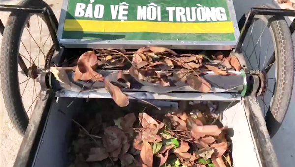Chiếc xe thu gom rác tái chế này có giá thành chưa tới 1 triệu đồng và thân thiện với môi trường nhờ sử dụng các vật liệu tái chế. Xe cũng có tính cơ động cao khi người lao công dễ dàng điều khiển quanh sân trường.