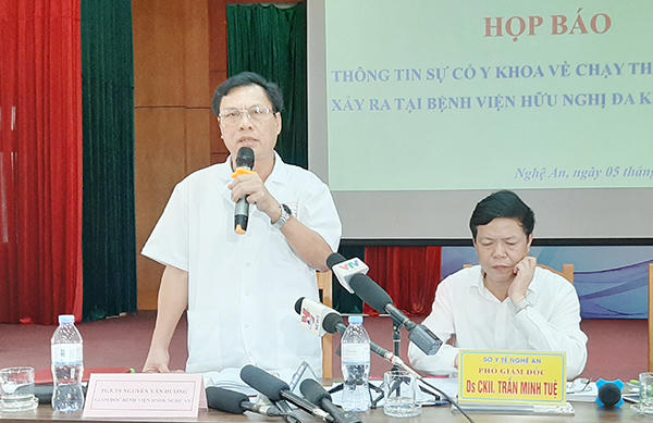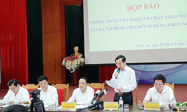 Sáng 5/8, Sở Y tế Nghệ An thông tin trước báo giới về sự cố y khoa chạy thận nhân tạo xảy ra tại Bệnh viện hữu nghị đa khoa Nghệ An khiến 10 bệnh nhân có biểu hiện bất thường.
