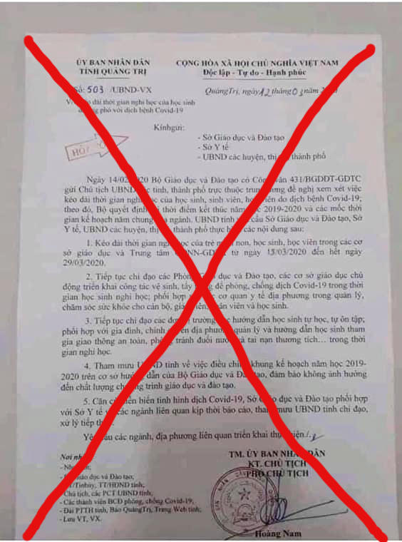 Cụ thể, vào sáng cùng ngày, trên mạng xã hội Facebook lan truyền công văn "hỏa tốc" số 503/UBND-VX ký ngày 12/3, do UBND tỉnh Quảng Trị ban hành về việc kéo dài thời gian nghỉ học của học sinh để ứng phó với dịch bệnh Covid-19.