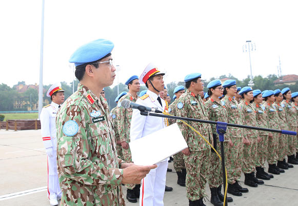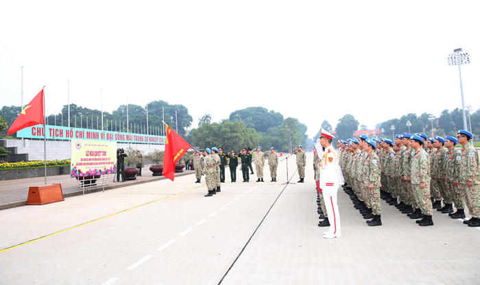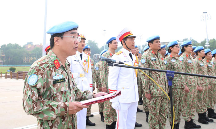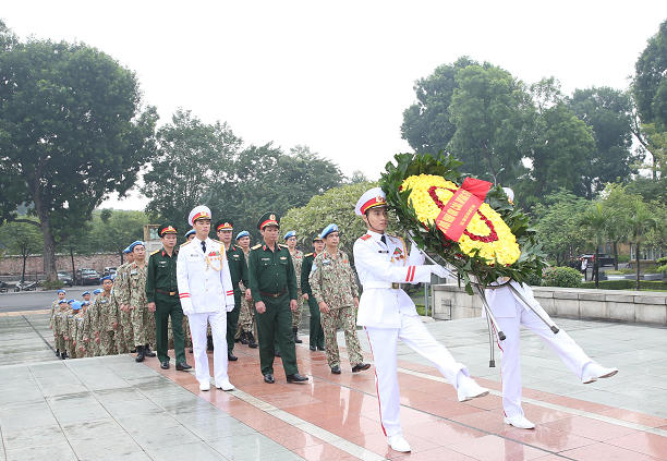 Trong không khí trang nghiêm, xúc động, trước anh linh của Chủ tịch Hồ Chí Minh kính yêu, thay mặt toàn thể cán bộ, nhân viên, chiến sĩ Cục Gìn giữ hòa bình (GGHB) Việt Nam, Thiếu tướng Hoàng Kim Phụng, Cục trưởng Cục GGHB Việt Nam báo cáo với Bác những thành tích Việt Nam tham gia hoạt động GGHB Liên hợp quốc...